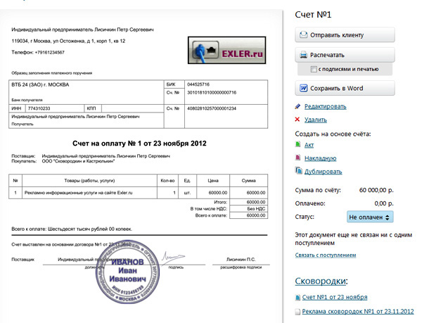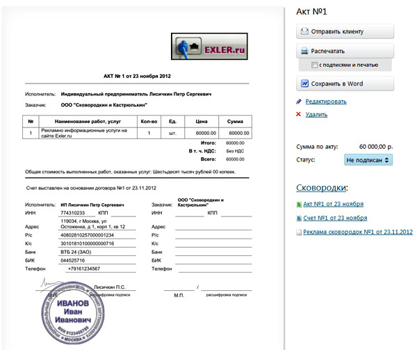 Однако на практике выясняется, что, как ни крути, документооборот у меня получается неслабый. Я же работаю "в белую", то есть с каждым клиентом заключается договор (размещение баннера, рекламный пост и так далее), выставляется счет, затем составляется и подписывается закрывающий акт - все как полагается. И если мне эти бумаги, в принципе, не нужны, то они нужны рекламодателям и другим заказчикам, так что их все равно приходится составлять.
