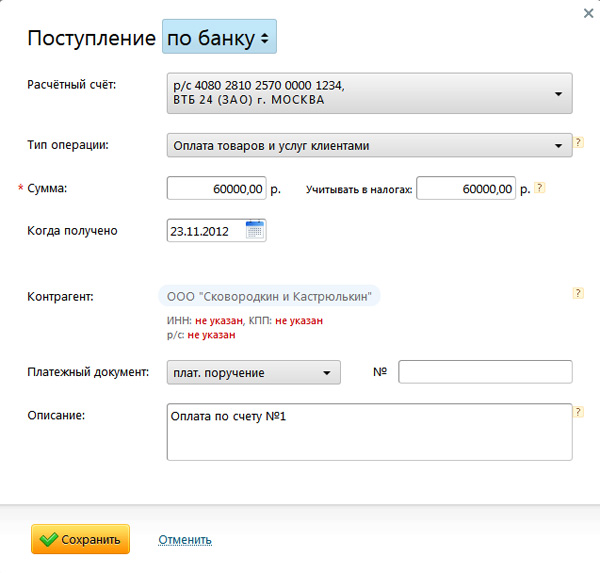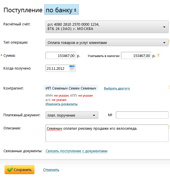 Этот клиент сделал заказ и оплатил его. Вносим деньги без всяких договоров.