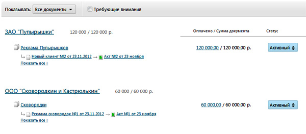 Кстати, есть полная интеграция с двумя банками (автоматически приходят выписки, можно выгружать в банк платежки, виден баланс). Когда сваливается выписка - бывает что автоматически определяет номер счета и связывает поступления (отмечает счет оплаченным). Есть раздел "Закрывающие документы", в котором видно кому отправить акт, а кто еще не вернул подписанный.