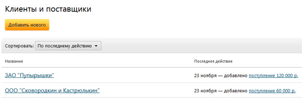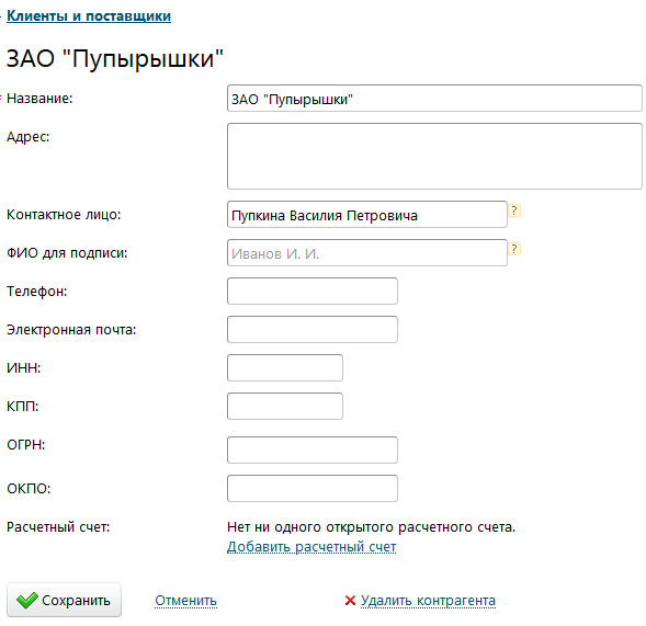 В системе ведется база клиентов и поставщиков, которую можно заполнять отдельно (а можно при создании документов).