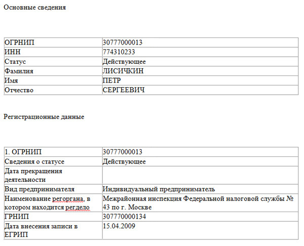 Там перечислены всевозможные сведения из госреестра, включая виды деятельности, лицензии, гражданства, даты постановки на учет в налоговых инспекциях и так далее.