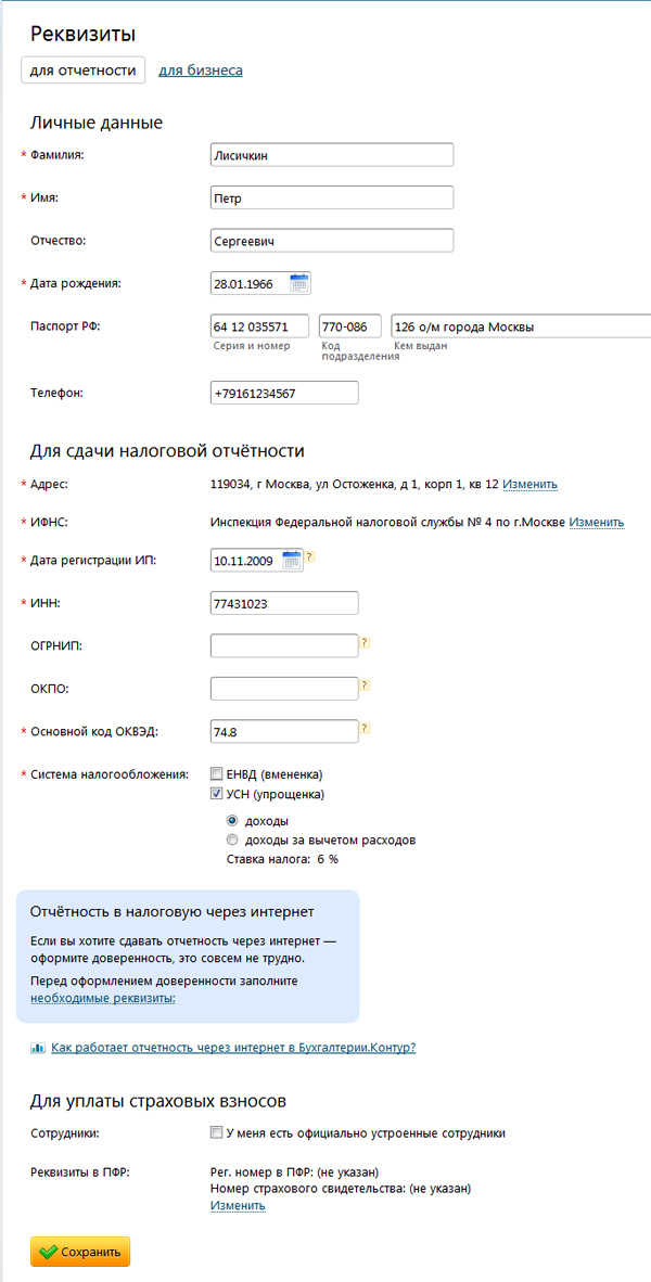 Чтобы обзор был достаточно наглядным, давайте просто создадим нового индивидуального предпринимателя в системе и сымитируем его бурную предпринимательскую деятельность.