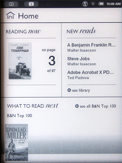 По кнопке Home или при старте системы появляется основное окно. В нем три основных раздела: что читается, новые книги, что прочитать следующим из магазина B&N.