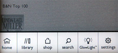 При нажатии Home на десктопе (или любом другом окне из меню) появляется нижнее меню с пиктограммами: домой, библиотека, магазин, поиск, подсветка, установки.