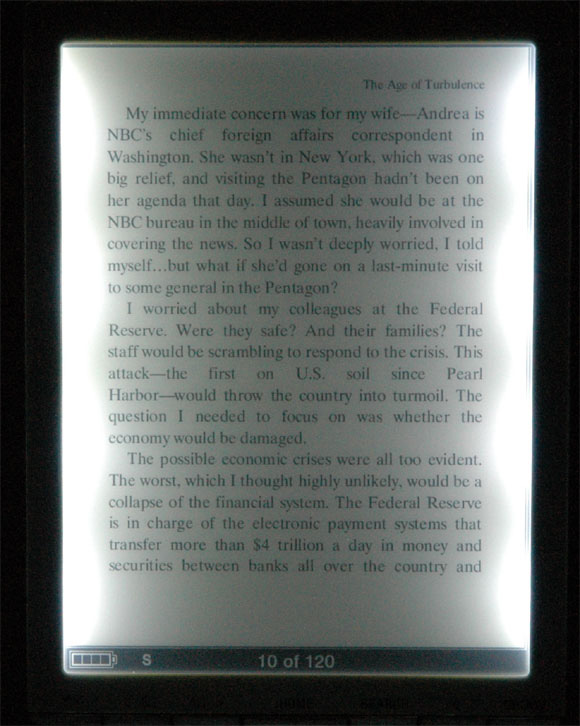 В Barnes&Noble учли опыт предшественников и пошли слегка другим путем. Слегка - потому что для освещения дисплея на электронных чернилах нет возможности подсвечивать его снизу, как в TFT-дисплеях. Так что на него можно светить только с боков. Однако делать рамку и встраивать в нее светодиоды - значит, получить такое же неравномерное освещение, как получилось у Sony.