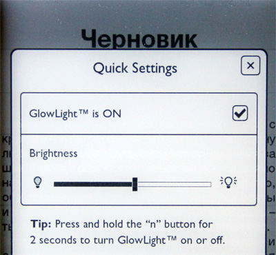 Подсветка при этом гибко регулируется. Это можно делать через пункт меню GlowLight, это можно делать просто по щелчку пиктограммы с лампочкой, появляющейся на верхней строке состояния. Появляется вот такое окно настройки.