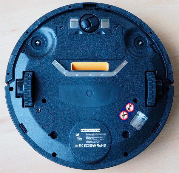 Смотрим на пузико. Два закрепленных на оси колеса, одно вращающееся колесо, отверстие для засасывания пыли и мусора, лампа ультрафиолетового обеззараживания (любопытно, кстати, я эти лампы в роботах-пылесосах пока не встречал), ну и два вращающихся вала для боковых щеток.