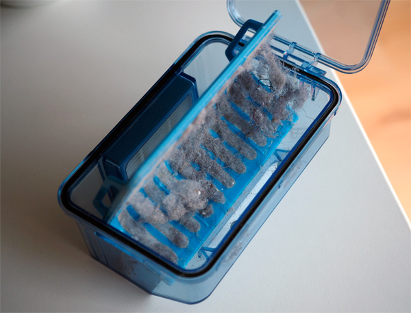 Кстати, мощность всасывания у него действительно хорошая и убирается пылесос вполне эффективно: вот, например, что скопилось в контейнере после буквально 15-минутной обработки комнаты, где два дня назад делали очень тщательную влажную уборку. (Впрочем, там все время открыта дверь-панель и с улицы постоянно летит всякая пыльца, так что неудивительно.)