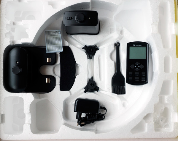 Комплектация: робот-пылесос, база для подзарядки, адаптер питания, пульт ДУ, ограничитель "виртуальная стена", запасные боковые щетки, щетка для очистки фильтров, запасной HEPA-фильтр, руководство по эксплуатации, гарантийный талон, две полоски ленты 3М (прикреплять стационарно зарядное устройство и ограничитель).