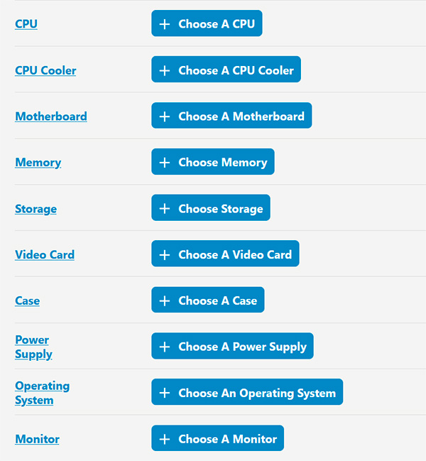 На этом сайте могут порекомендовать готовые сборки под различные задачи, которые можно модифицировать под себя, а можно сразу переходить к подбору, если вы примерно представляете, что вам нужно.