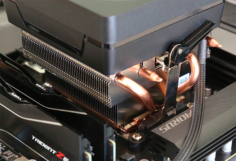 Установил. Ну и при этом наступил на известные грабли: на фото видно, что радиатор кулера упирается в модель памяти (у памяти тоже есть свой радиатор, который увеличивает ее высоту), ну и в результате крышка корпуса не закрывается. Я и так это все крутил, и сяк - без толку. И поперек данный кулер в силу особенностей крепления не поставить.