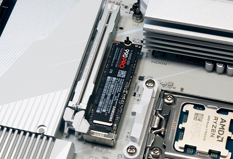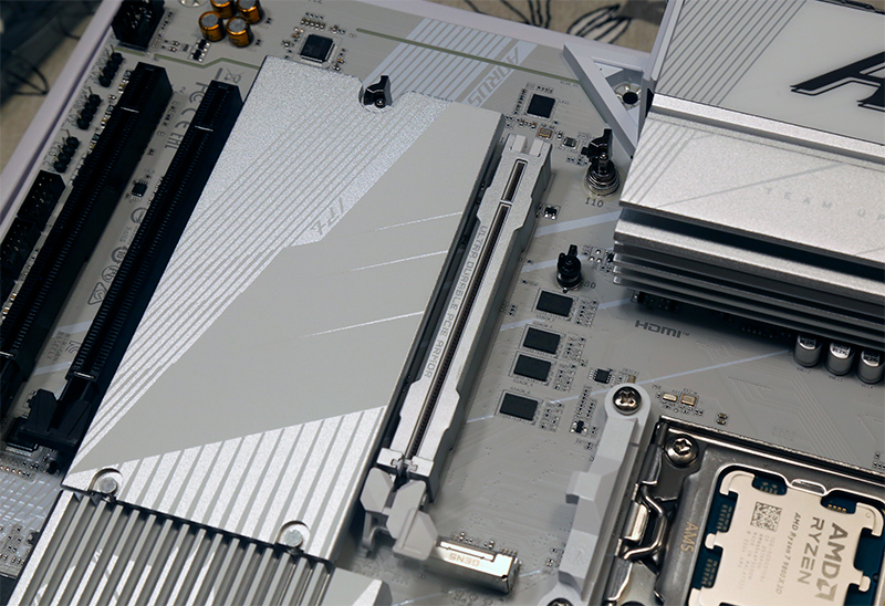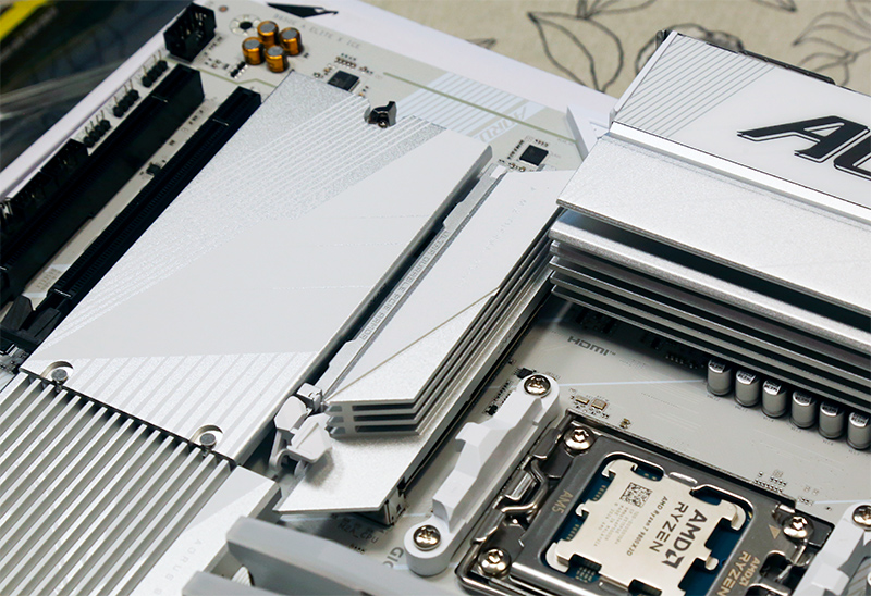 Теперь диск SSD. На фото материнской платы выше видны две плоских пластины охлаждающих радиаторов для SSD M.2 - тут три слота, два радиатора. На фото ниже один радиатор уже снят, чтобы туда поставить плашку SSD.