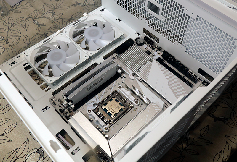 Проверили, что крепление системы охлаждения не требует установки крепления снизу материнской платы, после чего установили материнскую плату в корпус.