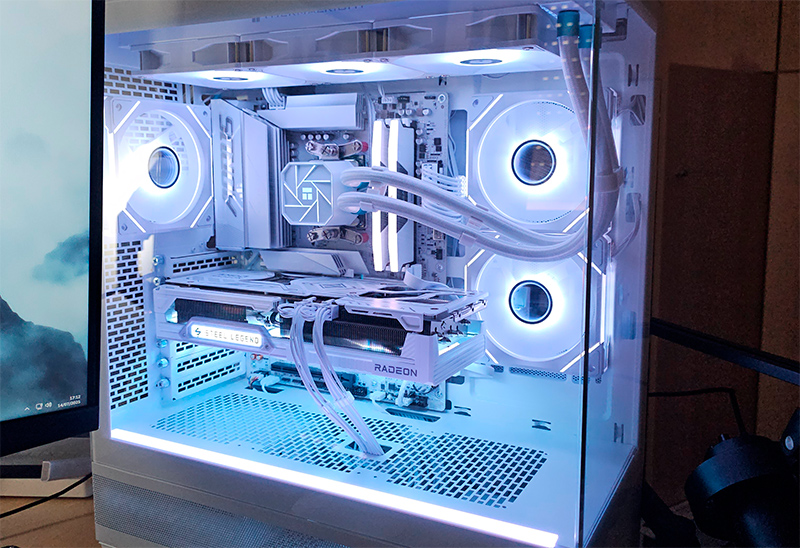 был(черный:-)). Камень точно такой же ryzen 7 7800x3d, опустил кривую на -30, он еще холоднее стал. Водянку поставил Arctic Liquid Freezer 3 280 (2 140x вентилятора), установил ее на вдув в корпус, камень в покое градуса 42-43, в играх около 65. Один 120й вентилятор на вывцв назад, один 140 на выдув вверх. Самое горячее место в системе-видеопамять на ускорителе-под нагрузкой добирается до 90 гр. Так как подключен oled телик в качестве монитора(по наводке Алекса) -то если игры и гоняются-то в 4к. Сборка спокойно тянет все больше 60ти кадров. Что еще нужно, чтобы спокойно встретить старость?))))