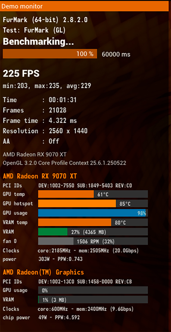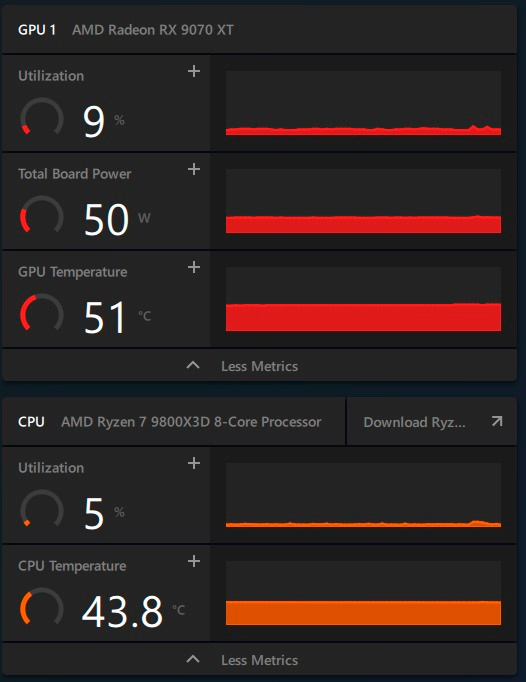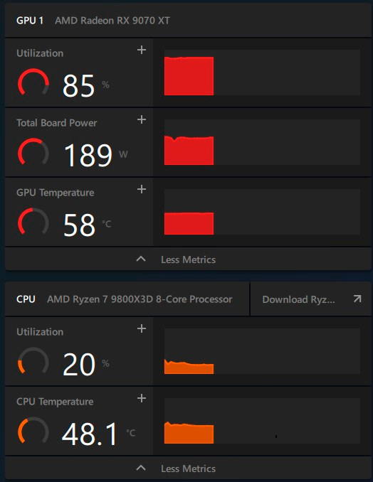 При этом моя 9070ХТ переделана на воду и это сбросило где-то по 20с с каждого компонента и сильно увеличило производительность (карта держит более высокие частоты стабильнее).