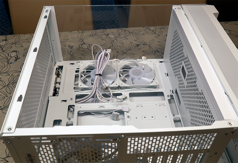 Достаем и открываем корпус. У него уже установлены три корпусных 120-миллиметровых кулера, которые надо подключить к питанию и к линии RGB.