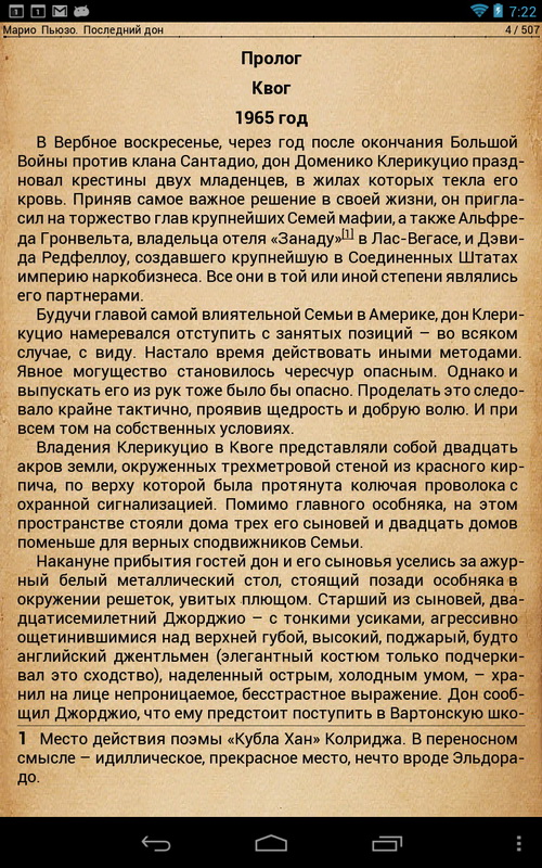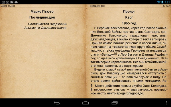 Для чтения по умолчанию ничего не установлено - ну, оно и слава богу, все равно ничего хорошего не предложат. Старый добрый CoolReader - читает без проблем. Правда, в данном случае я долго думал, что мне комфортнее - портретный режим или альбомный в две страницы. Понял, что на планшете в 7" все-таки лучше портретный. На 10-дюймовых я всегда читал в альбомном в две страницы. Здесь - мелковато, лучше портретный.