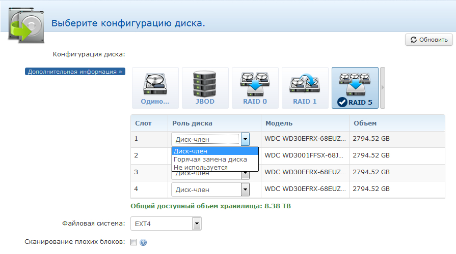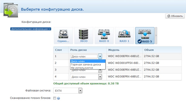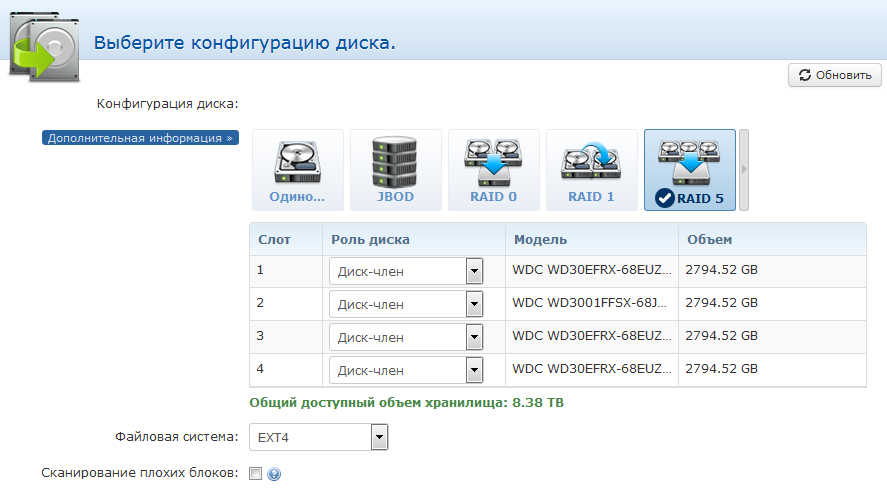 Что из этого выбрать? Вообще, для четырех дисков оптимальным считается RAID 10: тут тебе и производительность, и отказоустойчивость. RAID 5 дает больший объем, но меньшую производительность плюс очень долгий процесс восстановления при отказе одного диска.