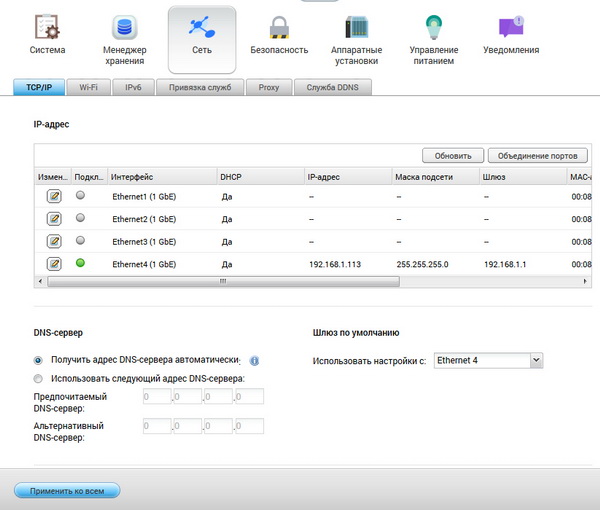Настройка сети. Тут, напоминаю, аж четыре сетевых порта. В домашних условиях они все вряд ли будут востребованы, а вот при использовании в офисе с помощью несколько портов можно решать следующие задачи:
