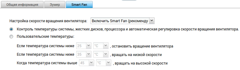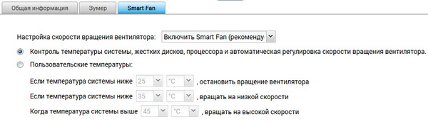 Настройки вентилятора. Лучше всего включать автоматическую регулировку - она хорошо работает.