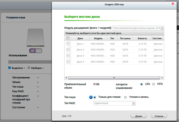 Отсеки для дисков вытаскиваются очень просто: достаточно пальцами потянуть за пластиковый выступ. Диск в отсеке крепится четырьмя винтами. Я в этот NAS установил четыре одинаковых диска WD Red по 3 Тб. Еще иногда, когда очень важна производительность, в такие NAS могут ставить три обычных диска и четвертый SSD для использования в качестве кеширующего диска - это может заметно повысить скорость работы.