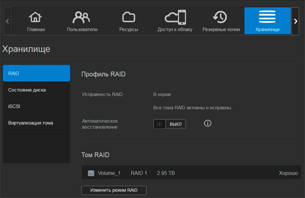 В разделе "Хранилище" можно задать режим используемых дисков. А их, как и ожидалось, несколько.