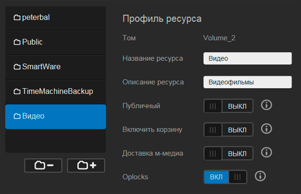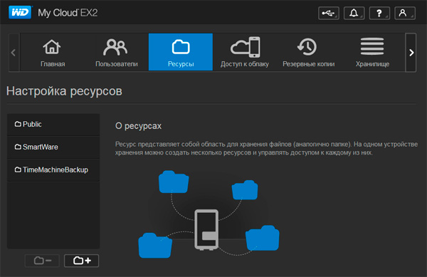 Далее идем в раздел "Ресурсы" - настраивать папки. Там есть папка Public (для всех), папка SmartWare (для всех) и папка TimeMachineBackup, предназначенная для хранения копий файлов компьютеров Apple.
