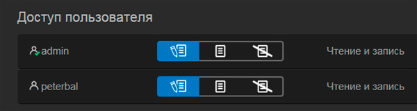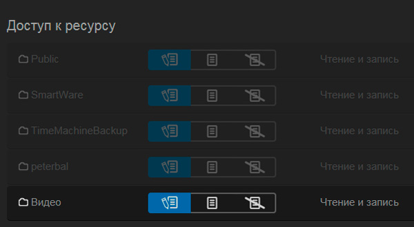 В разделе ресурсов также для каждого пользователя администратор (это вы) может задавать виды доступа. Для папок, открытых для всех, доступ по умолчанию установлен в чтение-запись, для папок не для всех можно устанавливать соответствующие разрешения.