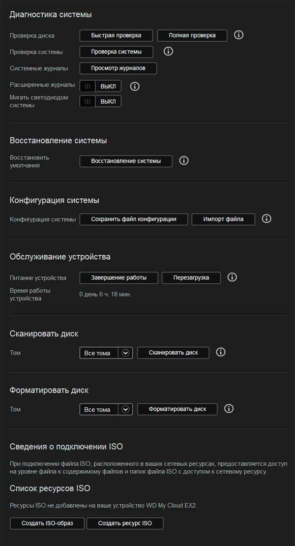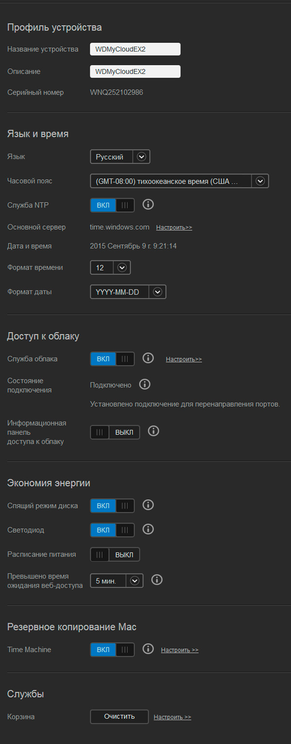 Ну и настройки накопителя. Есть возможность ухода дисков в спящий режим при неиспользовании - полезная штука.