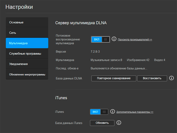 Подключение сервера мультимедиа DLNA и iTunes.