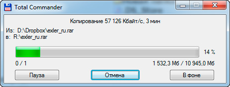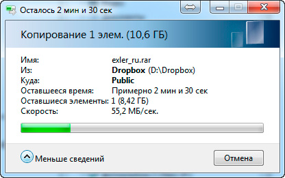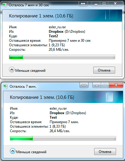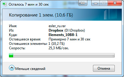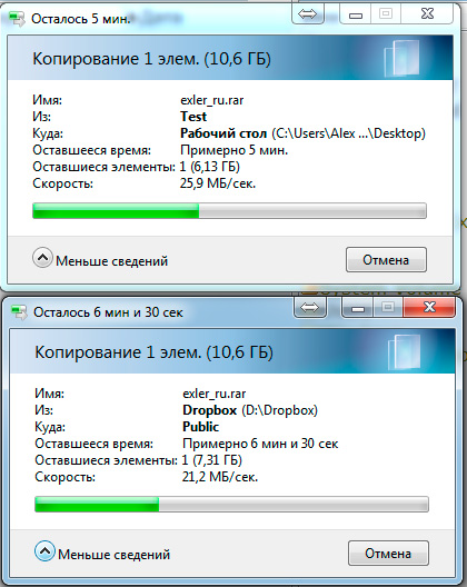 Копирование больших файлов на подключенный по USB 3.0 внешний диск - в два раза медленнее: примерно 25-26 мегабайт в секунду. На моих NAS - то же самое.
