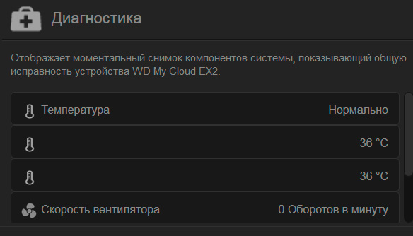 Накопитель работает очень тихо - его практически не слышно, даже когда он находится под постоянной нагрузкой. Температура дисков находилась в норме (менее 40 градусов), вентилятор я вообще ни разу не услышал. Вот, например, данные диагностики в тот момент, когда на NAS закачивались огромные (несколько десятков гигабайт) файлы архивов.