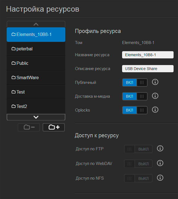 Также вы можете подключать к NAS внешние диски по USB, давать им свои названия и задавать виды доступа.