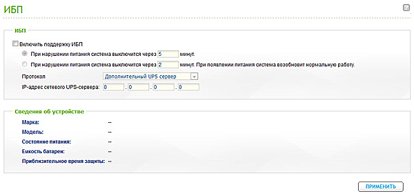 NAS поддерживает работу с источниками бесперебойного питания - вы можете задавать реакцию устройства на прекращение питания.