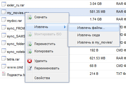 Тут доступны практически все виды действий с файлами: скачать, извлечь, переместить, копировать, удалить, переименовать, посмотреть свойства.