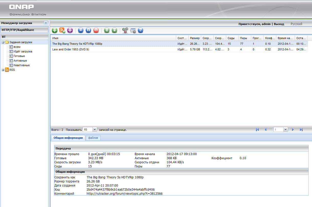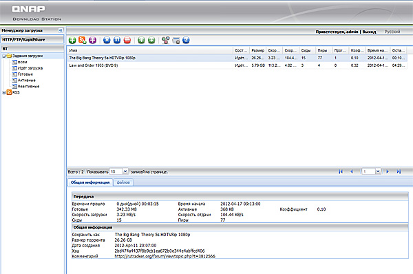 Менеджер загрузок позволяет работать с BitTorrent, HTTP, FTP и RapidShare. Таким образом, вы можете запускать загрузки непосредственно на NAS, не используя при этом компьютер.