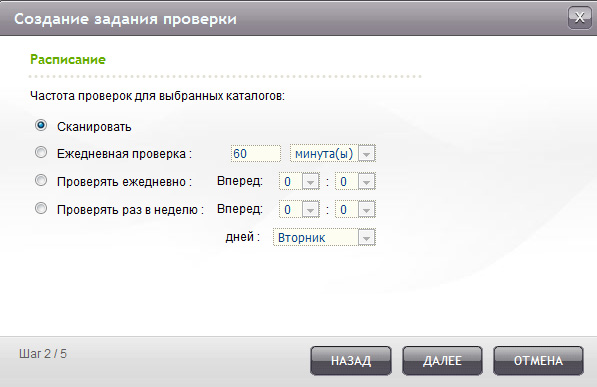 Постоянного мониторинга этот антивирус не производит, но может делать сканирование по расписанию. Действия при обнаружении вируса также выбираются - только сообщить, переместить в карантин, удалить.