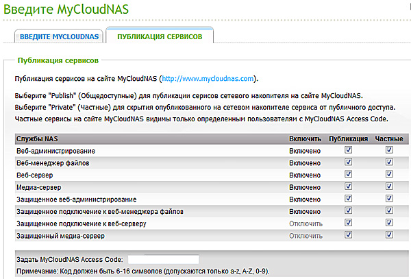 Далее вы даете имя своему серверу (он будет вида ваше_название.mycloudsnas.com) и определяете, какие сервисы публиковать и в каком доступе.