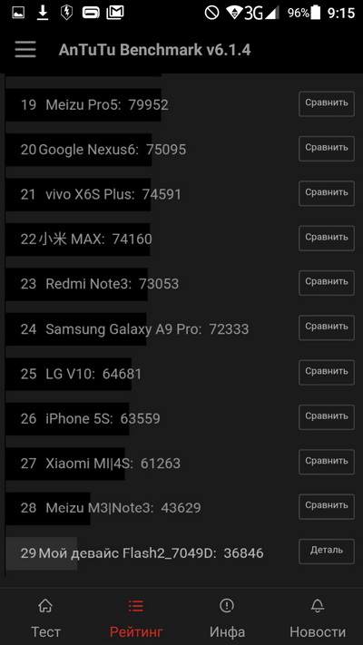 Тест по AnTuTu - 36864. Для сравнения Lenovo K3 Note - 46642.