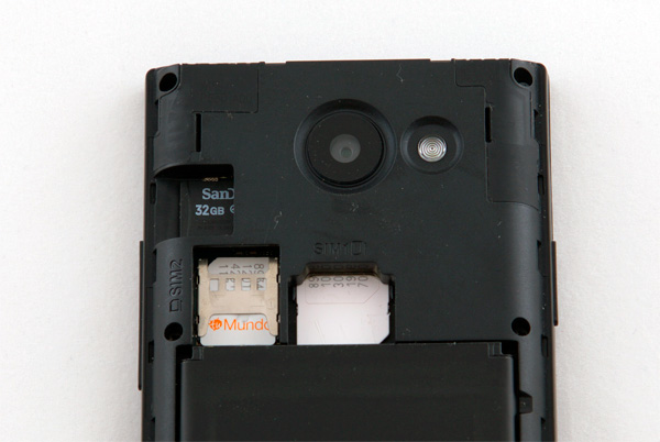 Под крышкой - съемный аккумулятор, слот для первой симкарты формата miniSIM, второй симкарты формата microSIM и слот для карты памяти microSD.