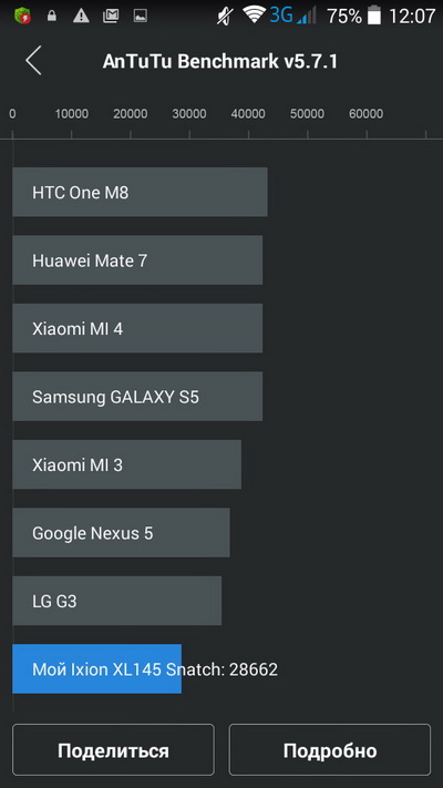 AnTuTu выдал индекс 28662. Это, кстати, вполне неплохо. Чисто практически - смартфон не производит впечатления "шустрика", но для обычных задач работает хорошо. На сильно тяжелых приложениях, бывает, "зависает" с загрузкой, но в общем и целом - не тормоз.