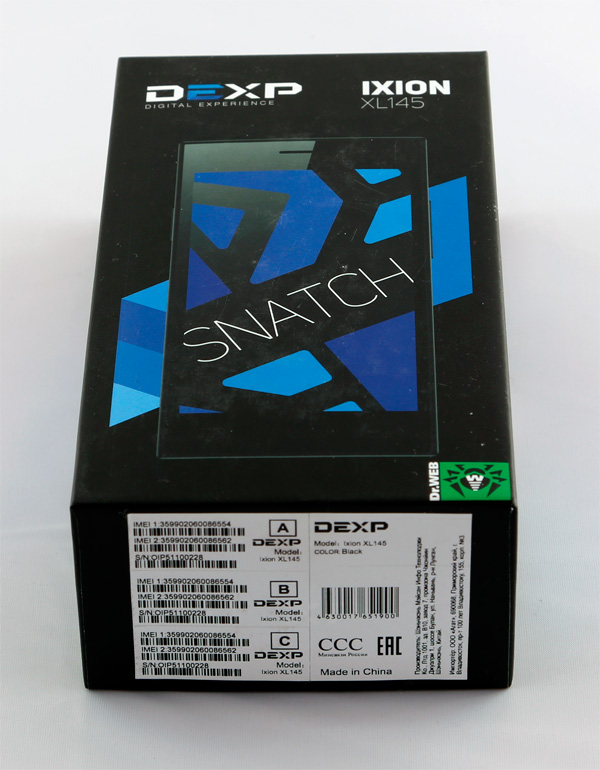 Традиционная для смартфонов DEXP черно-синяя коробка.
