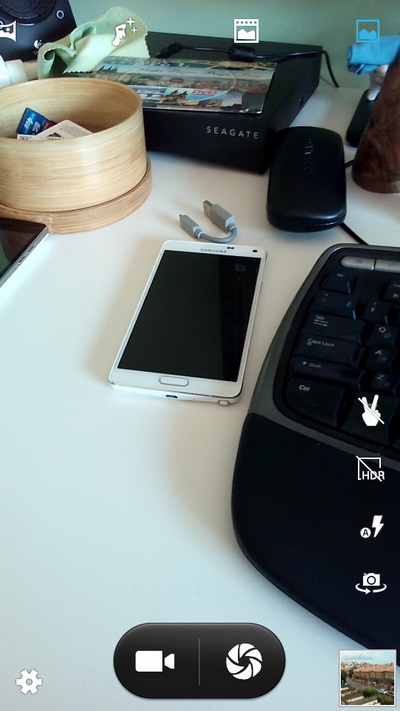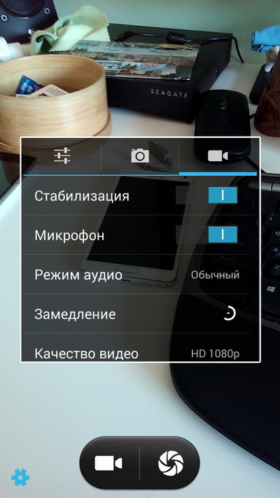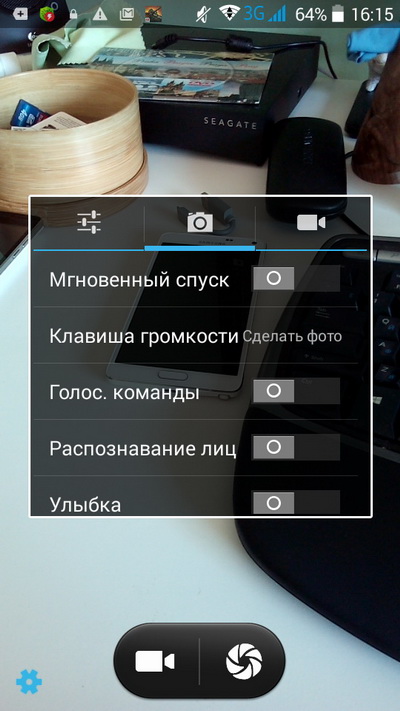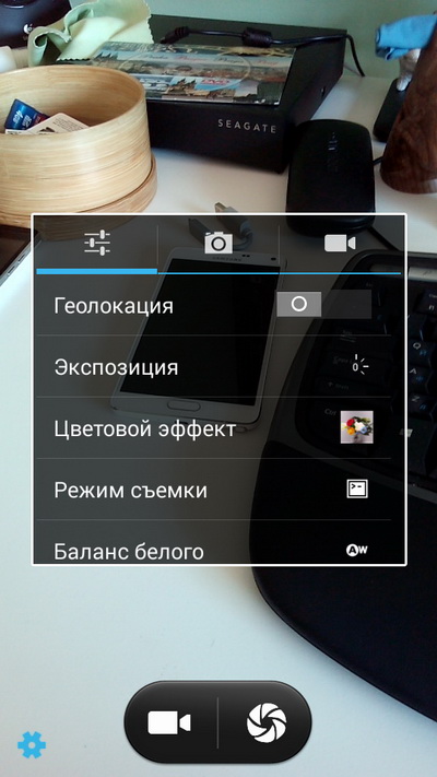 Простенький интерфейс. Реальная проблема у него: камера может фокусироваться по прикосновению пальца, однако область кнопок съемки фото и видео оттуда не исключена, поэтому в 3 случаях из 5, когда пытаешься нажать на кнопку съемки фото, оказывается, что ты просто заставляешь телефон фокусироваться не там, где надо. И съемка не происходит. Чтобы научиться нажимать эту кнопку так, чтобы сделать кадр, а не переместить точку фокусировки - надо очень долго тренироваться, причем даже обучение в Шаолиньском монастыре это все не сильно ускоряет. Ну правда - очень раздражало. Тем более что съемку прикосновением нельзя было отключить.