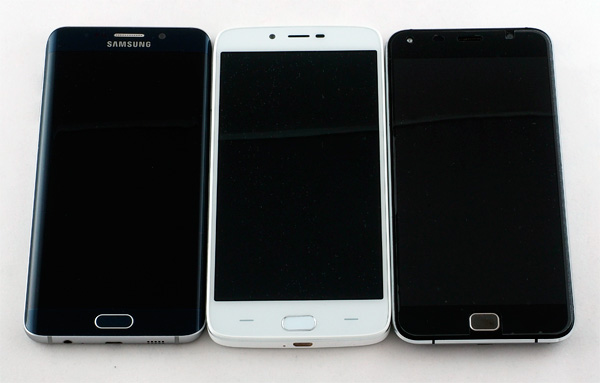 Вот наш герой в компании действительно люксового Samsung Galaxy S6 edge+ и UMI Touch 4G (тот, кстати, смотрится-то покруче; его обзор скоро будет).