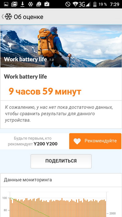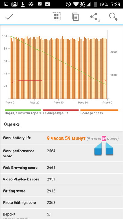 Синтетический тест. На комфортной яркости экрана и с включенными беспроводными видами связи PCMark провел тест смешанных режимов: серфинг, обработка фото, видео, чтение и так далее - то есть эмуляция хорошей загрузки смартфона различными стандартными действиями. Получилось вот что. И, кстати, это очень даже прилично.