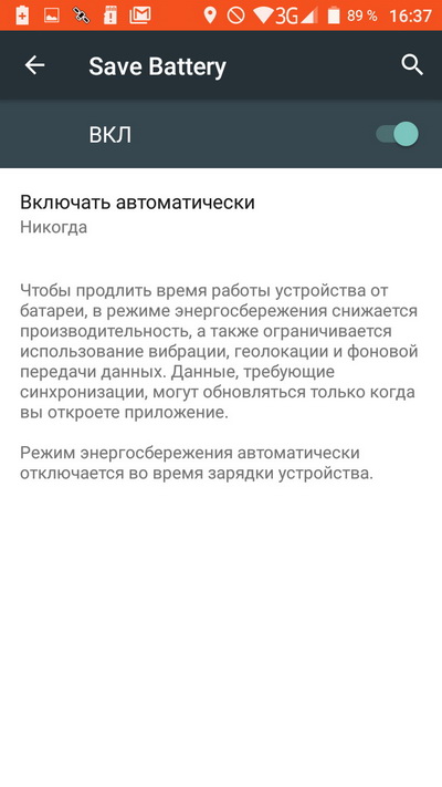 Есть режим энергосбережения. При этом включает в верхней строке состояния неприятный оранжевый фон, глушит яркость экрана, ограничивает фоновую передачу данных и производительность (и так, скажем прямо, невысокую). Без крайней необходимости использовать не рекомендуется.