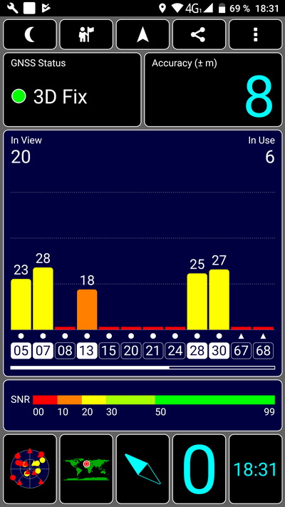 С определением координат проблем давно не встречал, но вот тут хорошо, что проверил. Холодный старт был довольно долгий, минуты две. Потом прочухалось, но смартфон использовал маловато спутников - при видимости аж двадцати, причем уровень сигнала был очень так себе. Давно такого не видел - тот же Xiaomi Mi Max 2 использовал 16 спутников из 19 с хорошим уровнем.