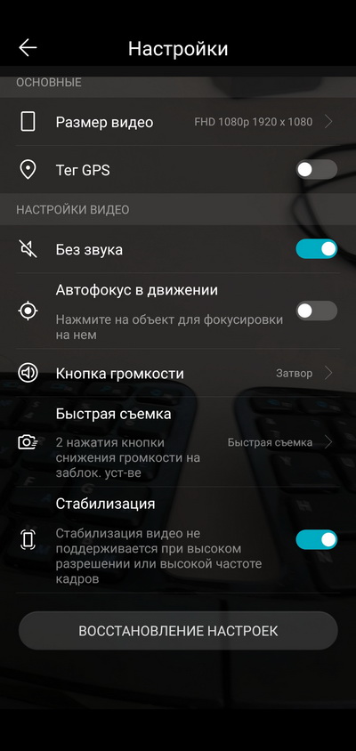 Настройки камеры. Стабилизация работает максимум для режима FullHD 30 fps. С увеличением частоты или разрешения стабилизация будет недоступна.