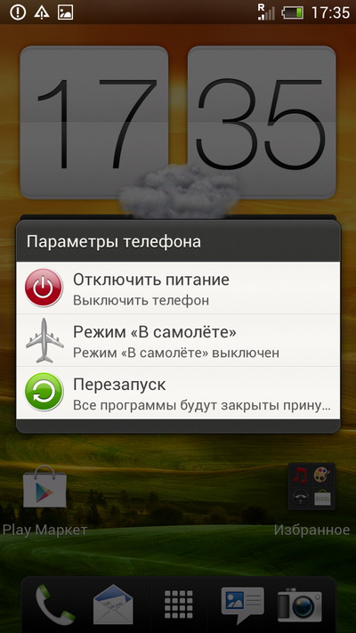 По нажатии кнопки питания выдается вот такое бедненькое меню. (У Samsung при этом можно вырубить передачу данных, переключить звук на вибрацию или выключить, что очень и очень полезно.)