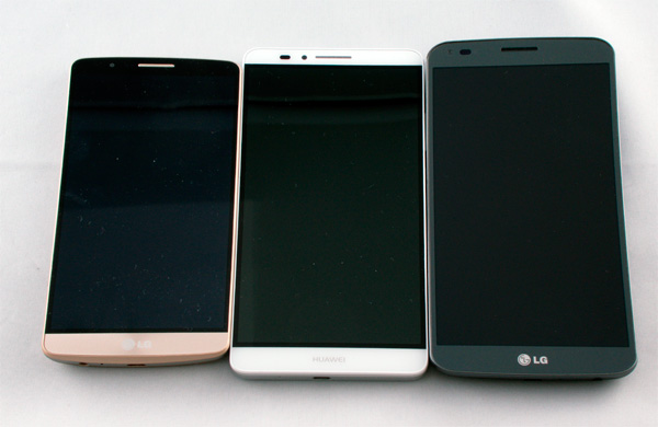 Ну и вот наш герой рядом с LG G3 И LG G Flex. Обратите внимание на то, что у LG G Flex размер дисплея такой же, а размер и толщина телефона - явно больше (причем там еще и разрешение 1280х720, а не FullHD, как здесь).